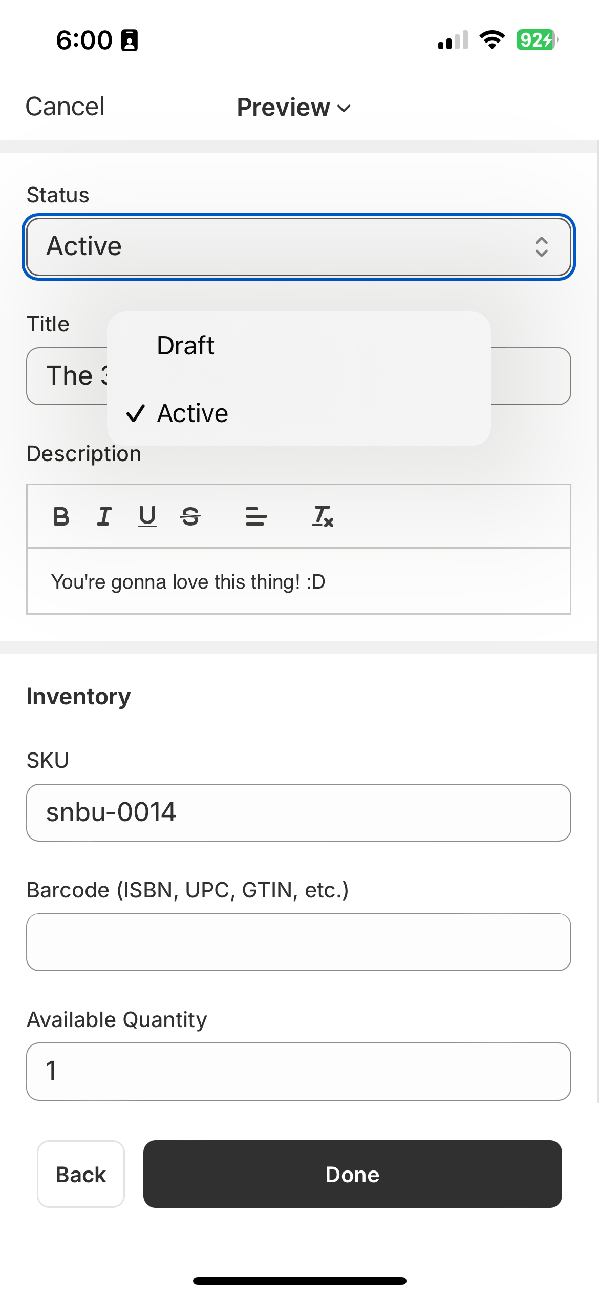 You can adjust the SKU, inventory, price, title, and description to your heart’s content. Uniquify will automatically set your new product to have an inventory of one, and will generate a new SKU based on your store’s unique format.