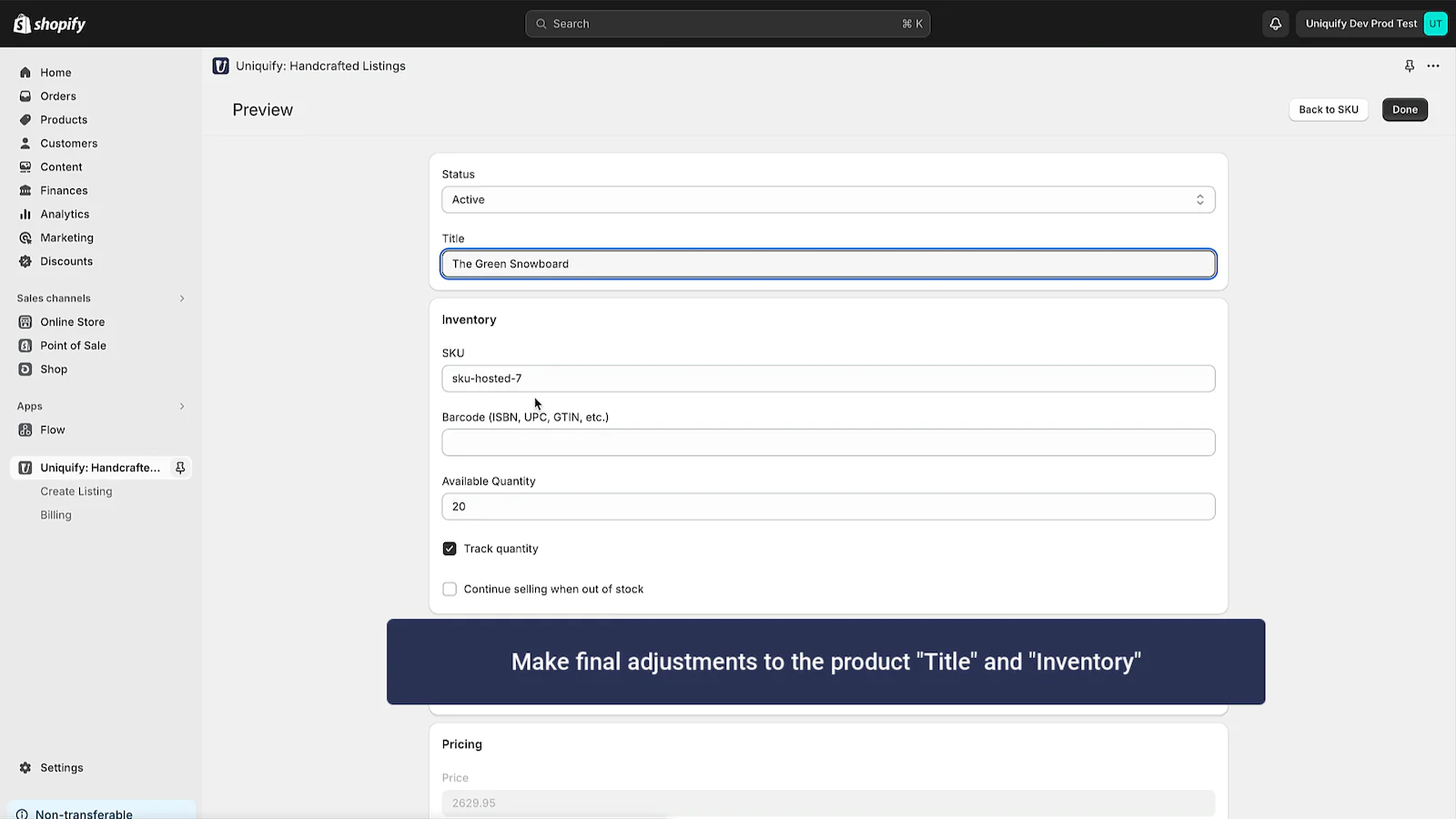 You can adjust the SKU, inventory, price, title, and description to your heart’s content. Uniquify will automatically set your new product to have an inventory of one, and will generate a new SKU based on your store’s unique format.