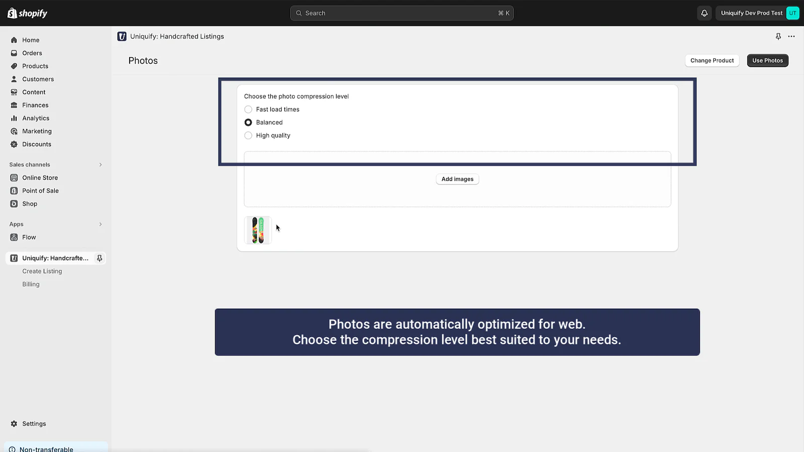 - Did you know photos straight from your phone will slow down your product pages? Any photos added via Uniquify are automatically optimized for mobile devices so customers can fall in love with your products faster!